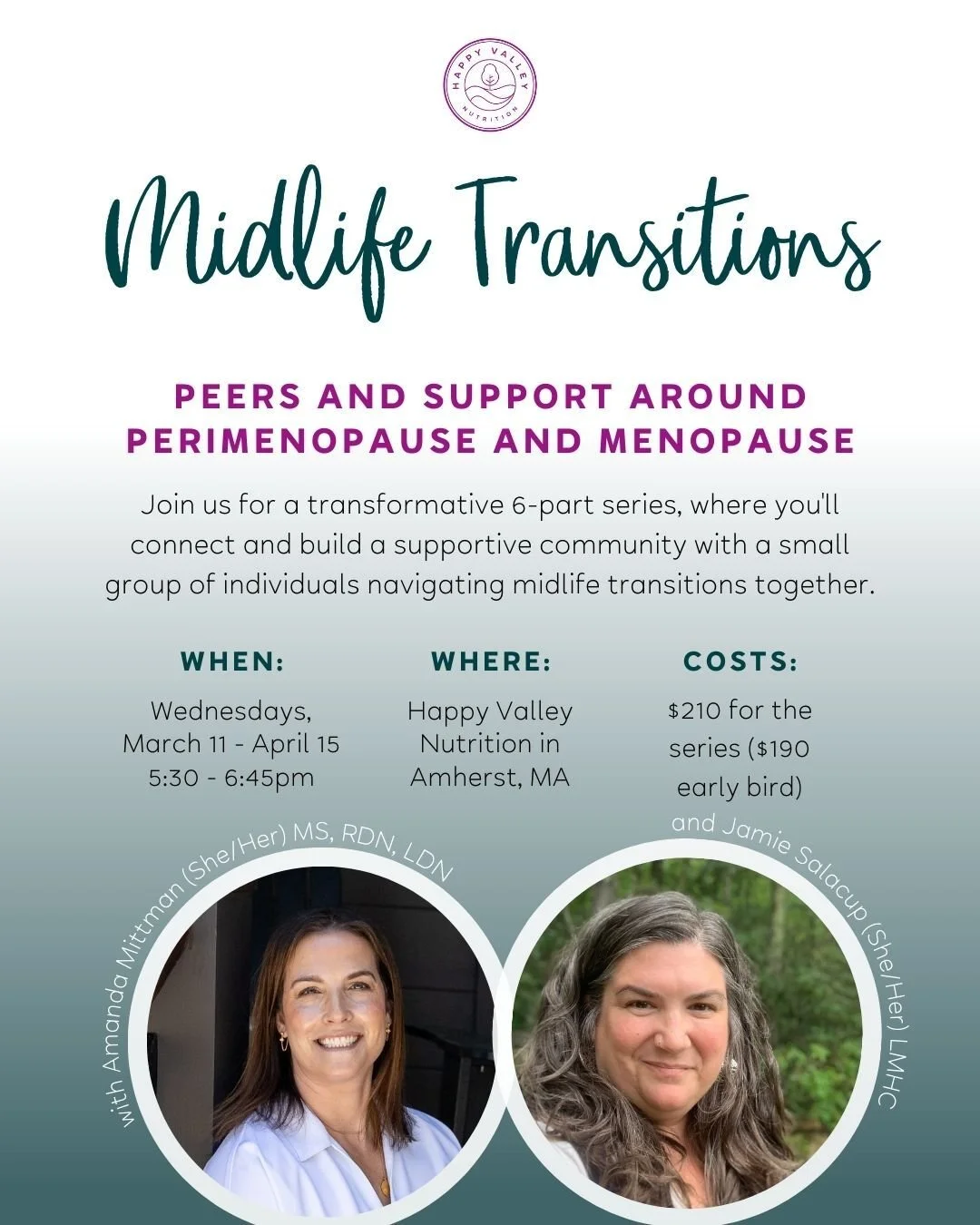 This group is co-hosted by Amanda Mittman, MS, RDN, LDN (she/her), Registered Dietitian and owner of Happy Valley Nutrition, and Licensed Mental Health Counselor Jamie Salacup, LMHC (she/her) who both have their feet firmly planted in perimenopause.